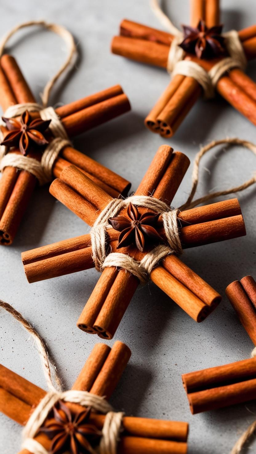Instructions: Arrange the cinnamon sticks into a star shape and hot glue them together at the ends. Wrap twine around each junction for extra support and a rustic look. For a special touch, glue a star anise at the center. Tie a loop of twine at the top to hang. These natural ornaments smell amazing and add a lovely, earthy look to the tree.