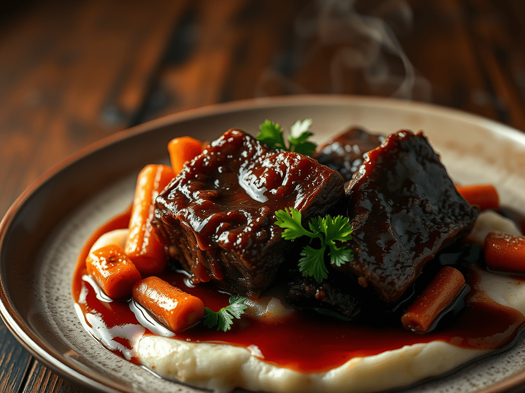 As the rich sauce coats the short ribs, the flavors meld together in a way that feels both luxurious and comforting, like a family tradition passed down through the years. This dish is perfect for family gatherings or quiet nights in, bringing everyone to the table to share in the warmth of good food and great company. Whether you’re creating new memories or honoring old ones, braised short ribs have a timeless appeal that invites us all to slow down and savor the moment.
