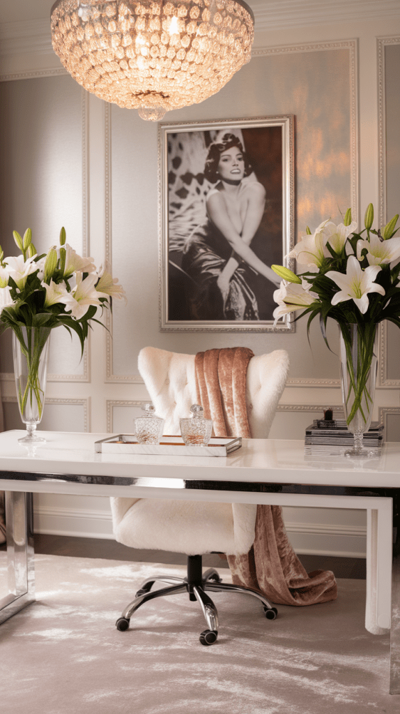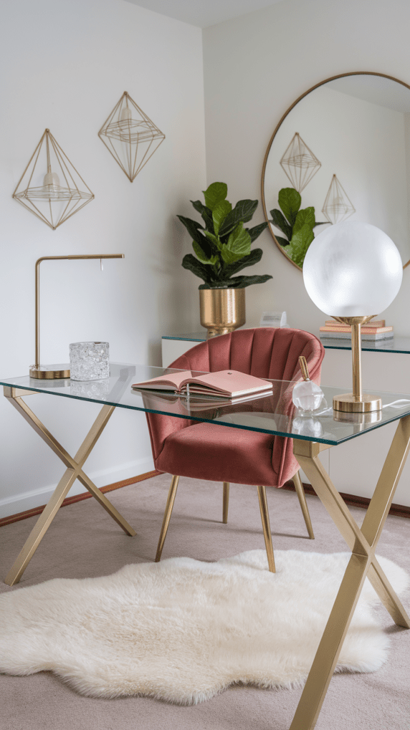- Modern Glam: Metallic accents, a glass desk, velvet furniture, and geometric decor.