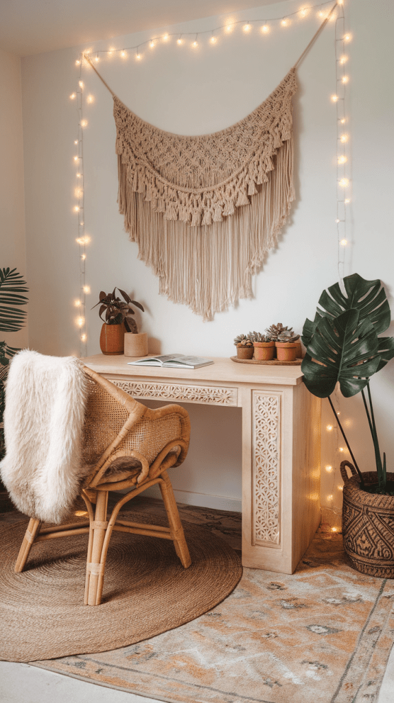 - Boho Chic: Natural wood furniture, macramé wall hangings, layered rugs, and woven baskets.