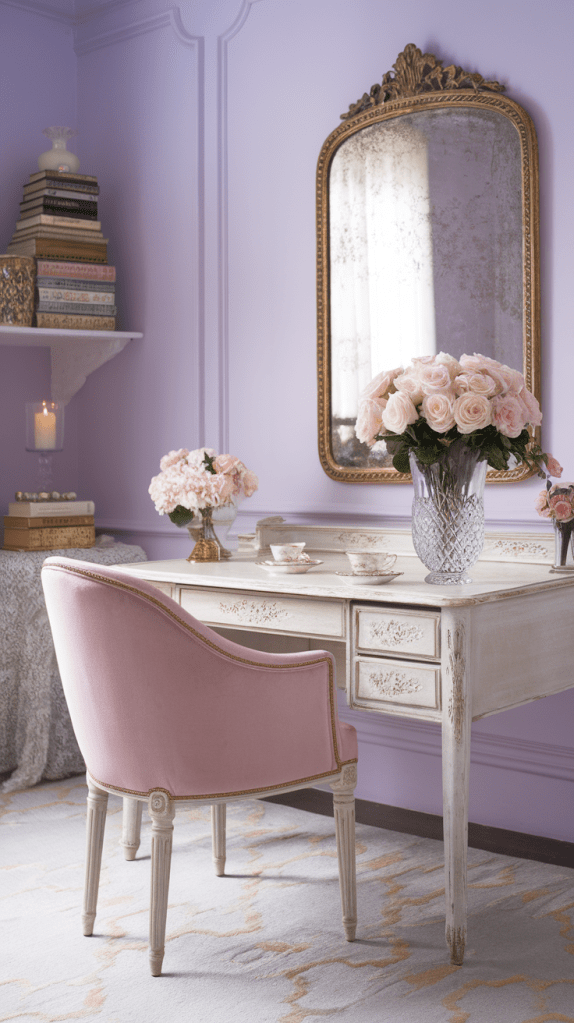 Feminine spaces often feature soft, soothing colors that evoke calm and creativity. Consider shades like blush pink, lavender, creamy white, sage green, or soft gray. Pair them with metallic accents like rose gold or brushed gold for a touch of glamour.