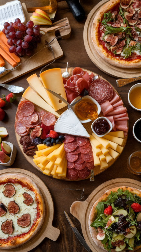 - Charcuterie Board with cheeses, cured meats, crackers, fresh fruit, and spreads.