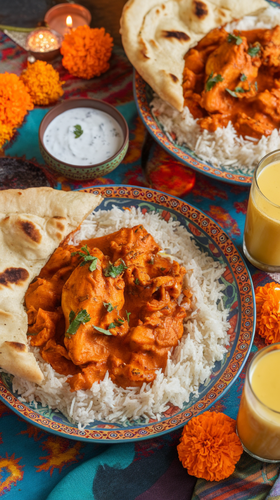 - Chicken Tikka Masala with basmati rice and naan bread.
