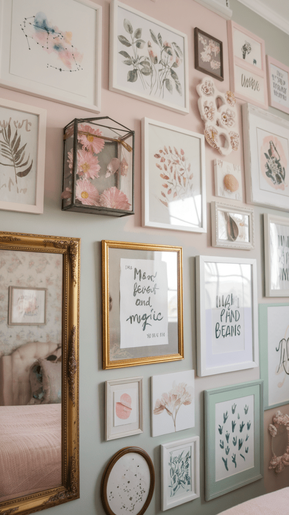 Curate a gallery wall filled with art prints, whimsical quotes, and perhaps even pressed flowers or dried herbs. Mix ornate frames with minimalist designs for a touch of eclectic charm.