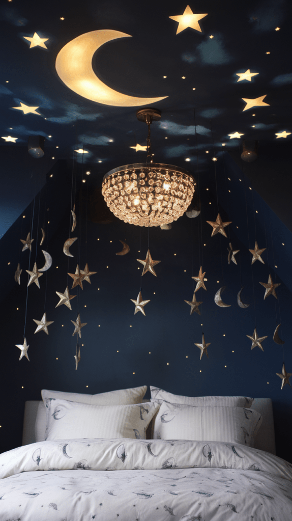 Paint your ceiling a deep navy or black, then add glow-in-the-dark stars or twinkling LED lights to mimic the night sky. For an extra touch, consider adding a crescent moon decal or hanging star-shaped mobiles.