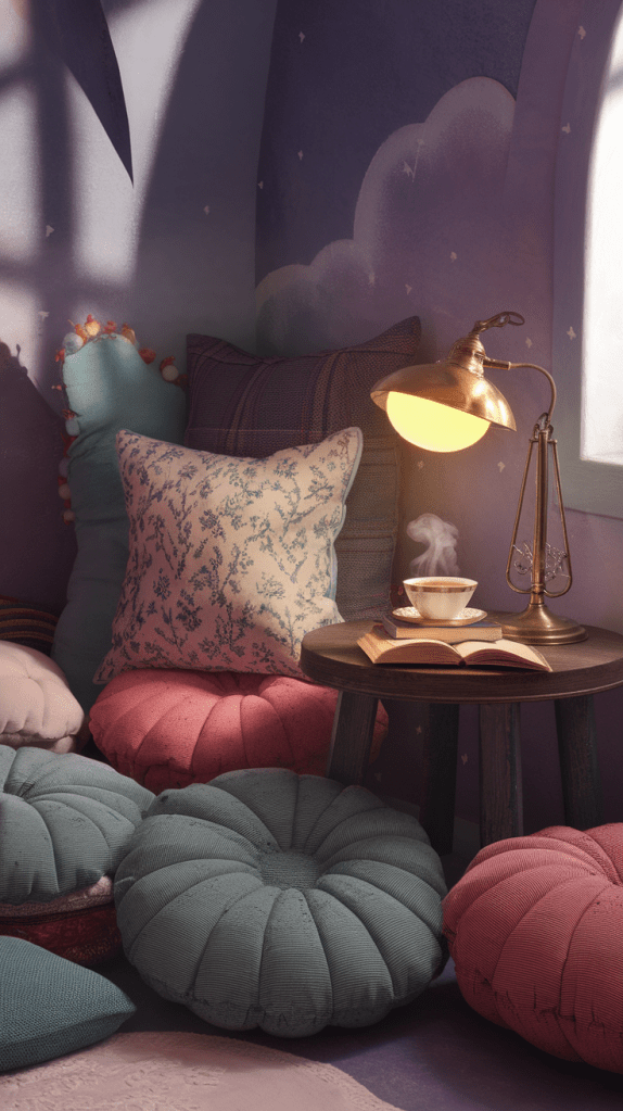 Set up a cozy corner with a small armchair or pile of floor cushions, a side table, and a lamp. This nook is perfect for daydreaming, journaling, or diving into your favorite fantasy novel.