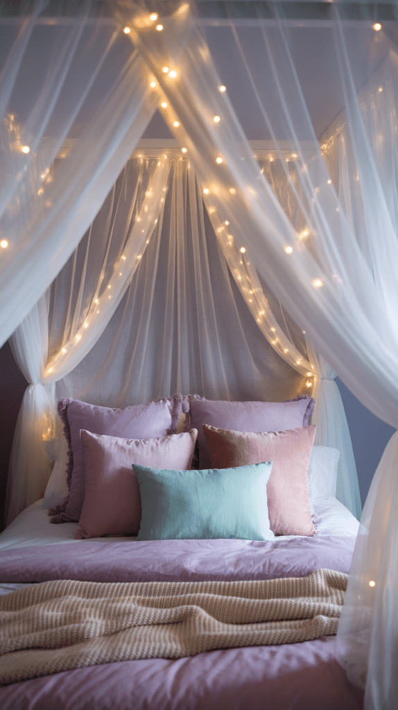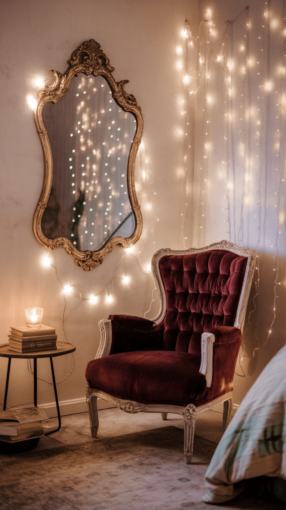 Nothing says whimsy quite like the soft glow of fairy lights. Drape them around your bedframe, hang them along the walls, or cluster them in a glass jar for an ethereal touch.