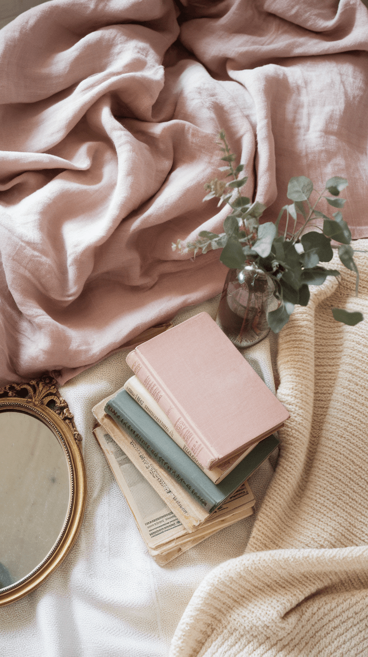 • Layering Textures: To add dimension, layer different textures such as velvet pillows, linen throws, and knit blankets in complementary shades like dusty rose, mauve, or soft gold.