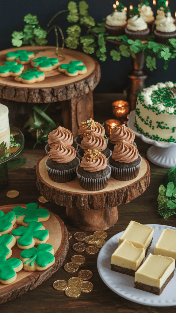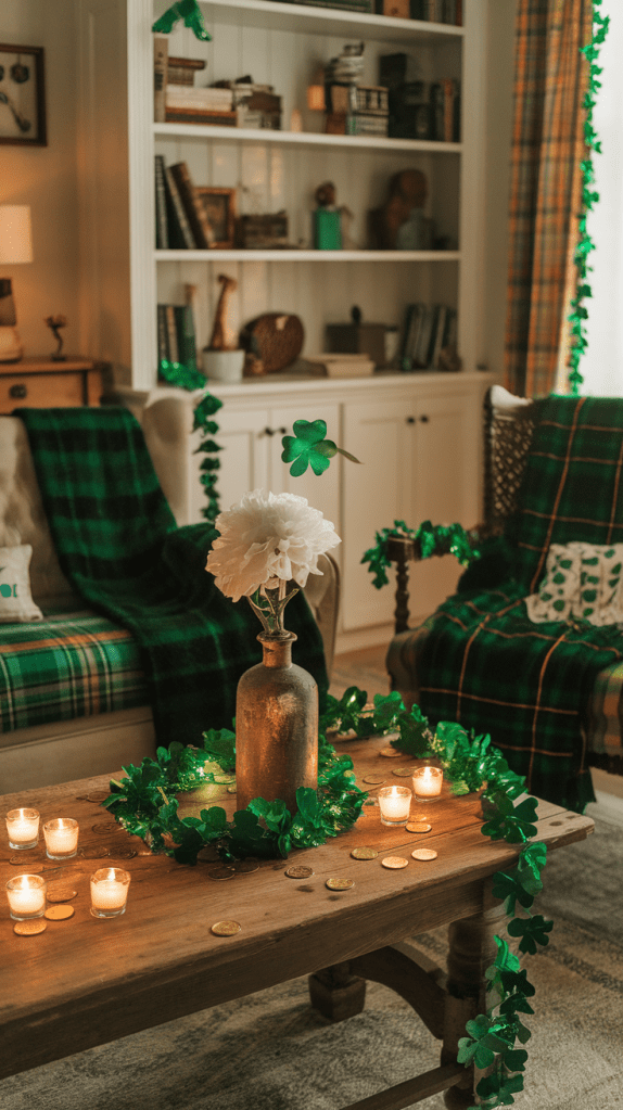 - Wall Decor: Hang a “Happy St. Patrick’s Day” banner, display vintage Irish prints or postcards, and add garlands of shamrocks or gold coins.