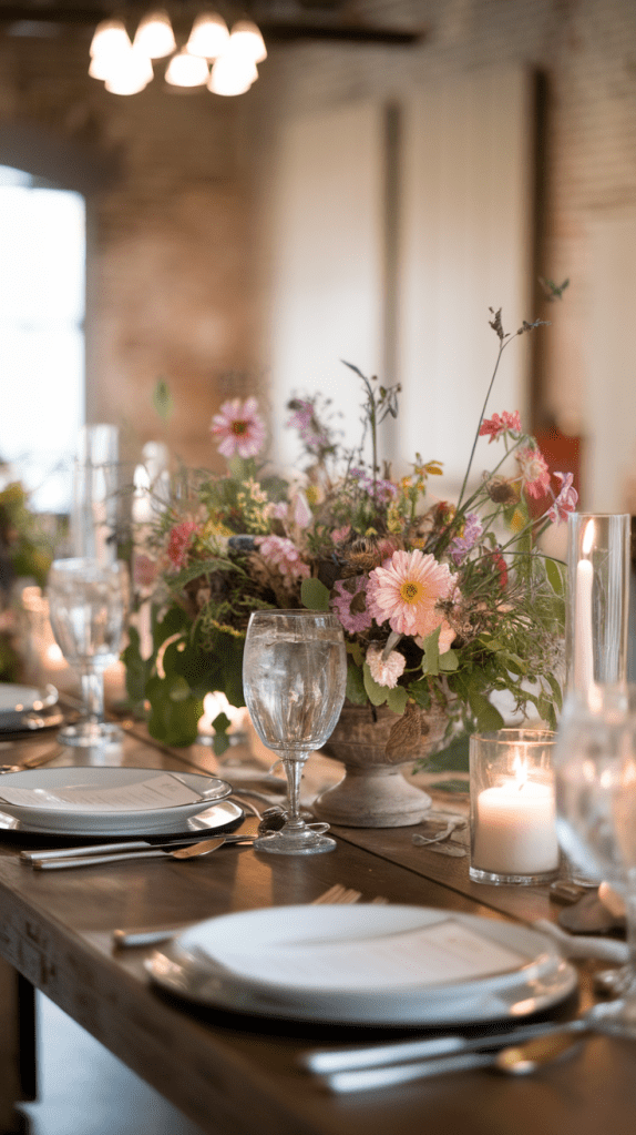 - Layer plates with pastel or vintage-inspired dishware.
