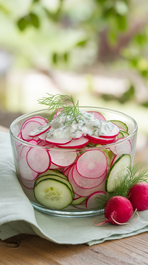 - In a mixing bowl, combine cucumbers, radishes, and fresh dill.
