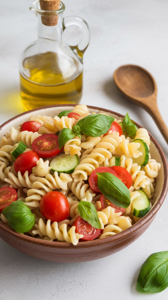 - In a large bowl, mix pasta, cherry tomatoes, cucumber, and basil.