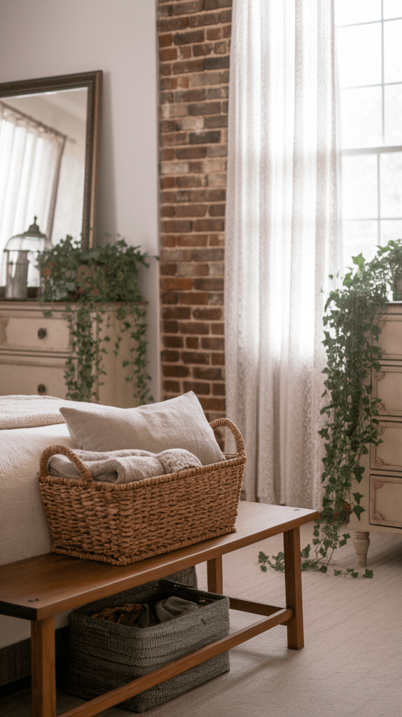 Decorate with potted plants, dried flowers, and fresh bouquets of seasonal blooms. Display a vintage vase filled with wildflowers on your nightstand or place a wicker basket of extra blankets at the foot of the bed. These small touches add life and warmth to the space.