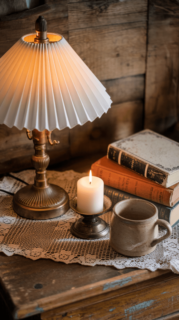 Soft, layered lighting is essential for creating a cozy and inviting atmosphere. Choose table lamps with fabric or pleated shades for a warm, diffused glow. Vintage-style wall sconces, chandeliers with crystal or brass details, and candle sconces add a touch of timeless elegance.