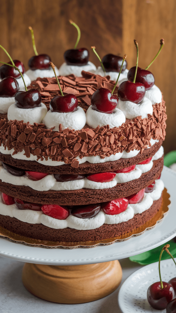A classic dessert with a rich history, this cake features layers of moist chocolate sponge soaked in cherry syrup, filled with whipped cream and cherries. Topped with chocolate shavings and fresh cherries, it’s a perfect balance of sweet, tart, and rich flavors that never goes out of style.