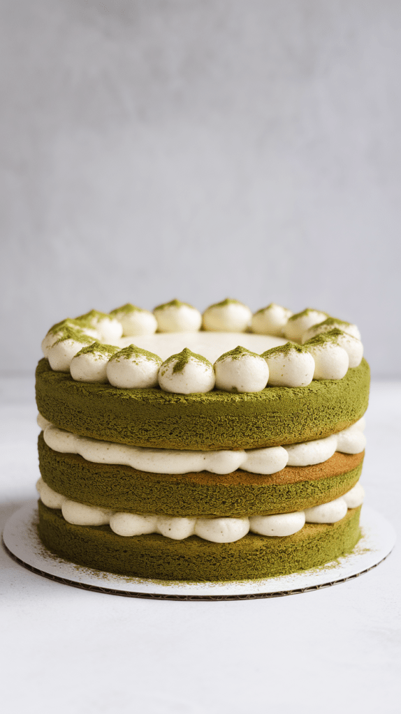 This modern cake features earthy matcha green tea sponge paired with sweet white chocolate buttercream, creating a sophisticated flavor contrast. Its vibrant green color makes each slice visually striking, while minimalist frosting and a sprinkle of matcha powder on top give it a sleek, contemporary look.