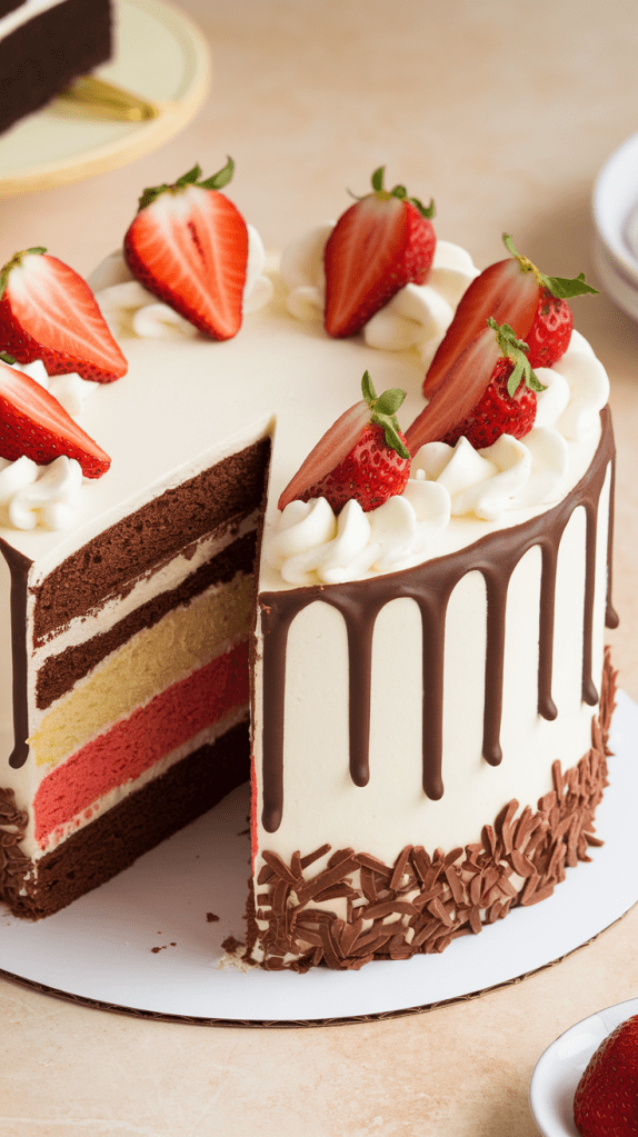 Inspired by the classic ice cream, this cake features layers of chocolate, vanilla, and strawberry sponge, creating a delicious trio of flavors. Frosted with smooth vanilla buttercream and decorated with swirls of chocolate and strawberry drizzle, this cake is both playful and nostalgic.