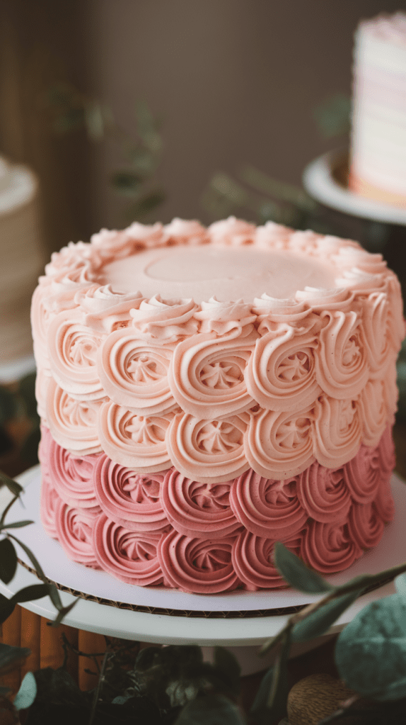 Soft vanilla cake layers are dyed in shades of pink, transitioning from deep rose to pale blush for a stunning ombre effect. Paired with vanilla or strawberry buttercream, this cake is both visually striking and delicious. Simple buttercream swirls or fresh flowers add a touch of elegance, making it perfect for women who love both fun and beauty.