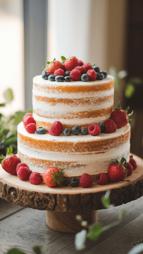 This rustic cake showcases its golden sponge layers with minimal frosting, allowing the cake’s natural beauty to shine through. Fresh strawberries, blueberries, and raspberries are arranged on top and between the layers, adding a pop of color and freshness without overwhelming the design.