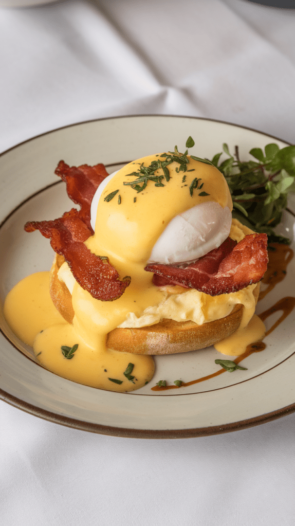 - Eggs Benedict – Poached eggs, ham (or I like American bacon), and hollandaise sauce on an English muffin.